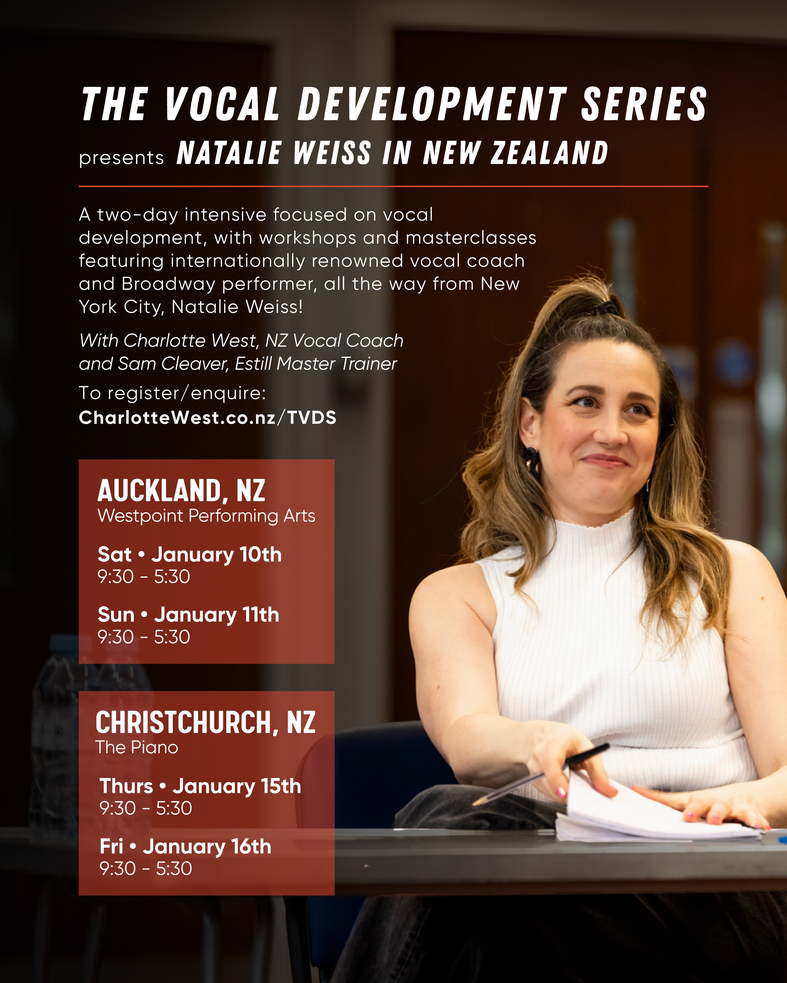 Join the first exciting event in ‘The Vocal Development Series’ presented by Charlotte West as we welcome to New Zealand the incredible Natalie Weiss, renowned vocalist and educator with a career spanning Broadway, West End, and beyond! With a concert in both Auckland and Christchurch following a two-day vocal workshop and masterclass event, this is an opportunity not to be missed for the musical theatre community in New Zealand.